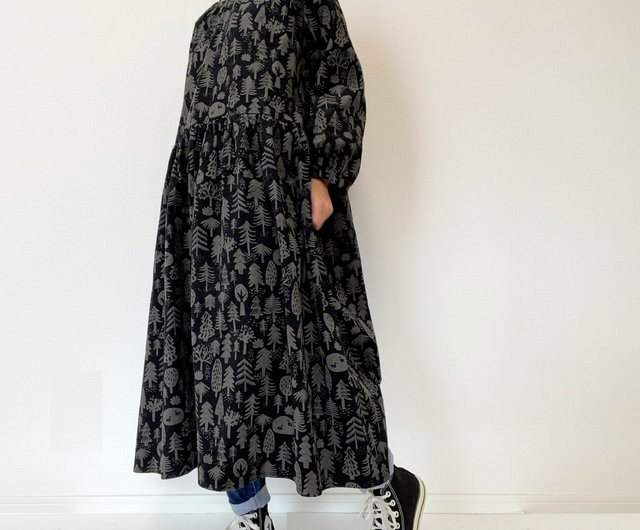 冬の森 ツリーの長袖ラグランワンピース あったかコーデュロイ 白鳥 コットン100 モノトーンブラック ショップ Loosey Goosey ワンピース Pinkoi